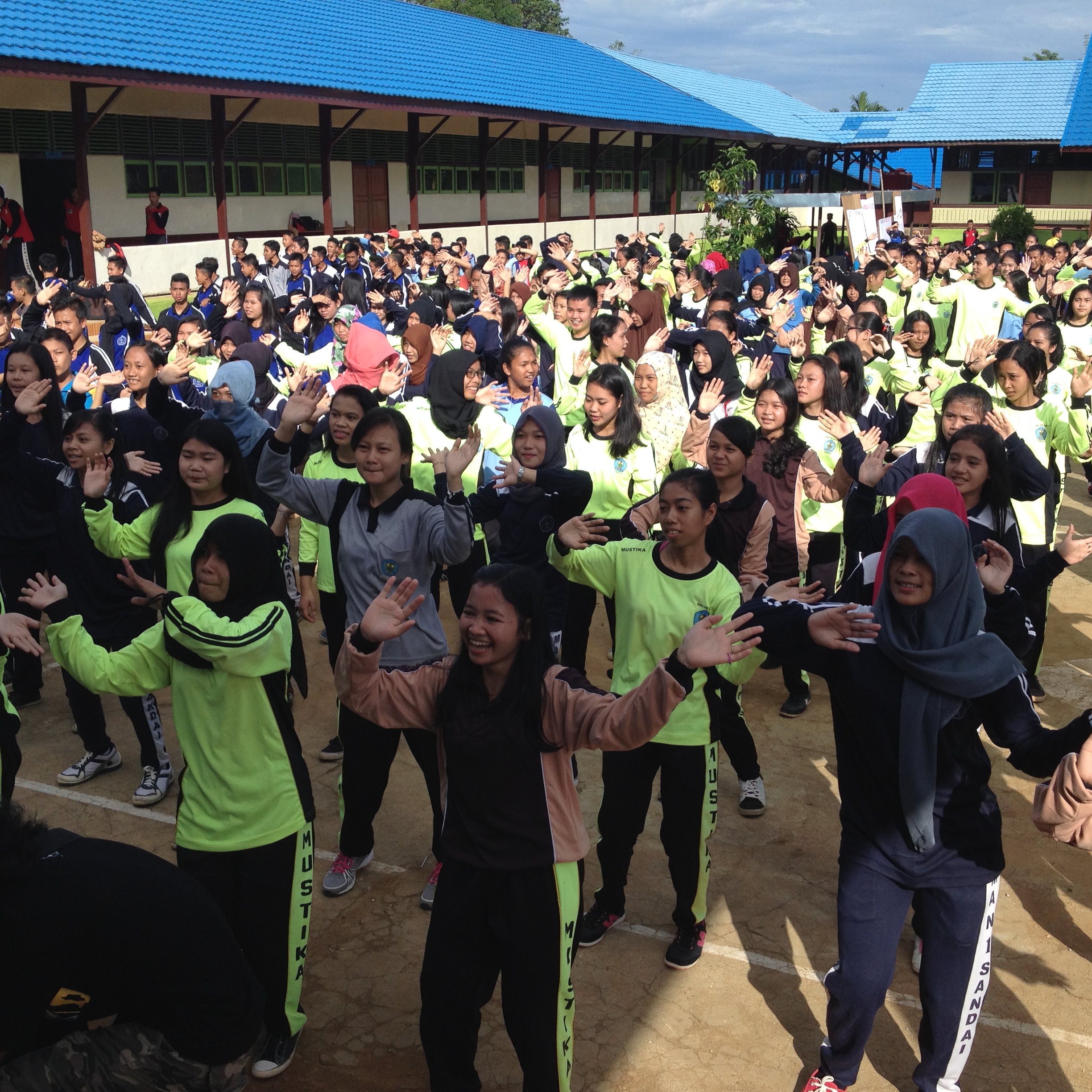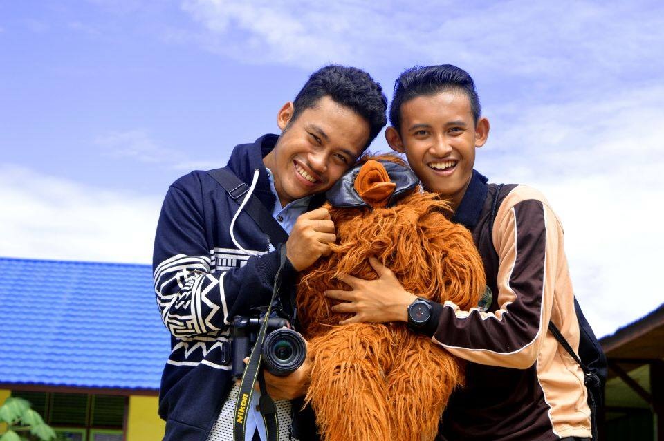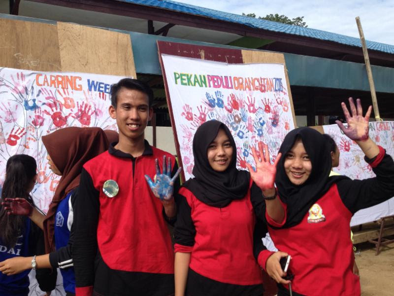 Earlier this month, on November 15th, we held our annual Orangutan Caring Week celebration. This year was a first in that we were in Sandai, a district that directly borders the eastern side of Gunung Palung National Park. Because the trip to Sandai requires a long, five-hour car ride over muddy back roads, the GPOCP Environmental Education team decided to spend all of Orangutan Caring Week visiting schools and community groups in two villages near the National Park. On the last day of Caring Week, known in Bahasa Indonesia as Pekan Peduli Orangutan, we held a “family fun day” at Sandai High School (SMAN 1), in the district”s largest town. Throughout the week, we promoted the theme “Sandai for Orangutan,” to get people excited about taking ownership over orangutan conservation.